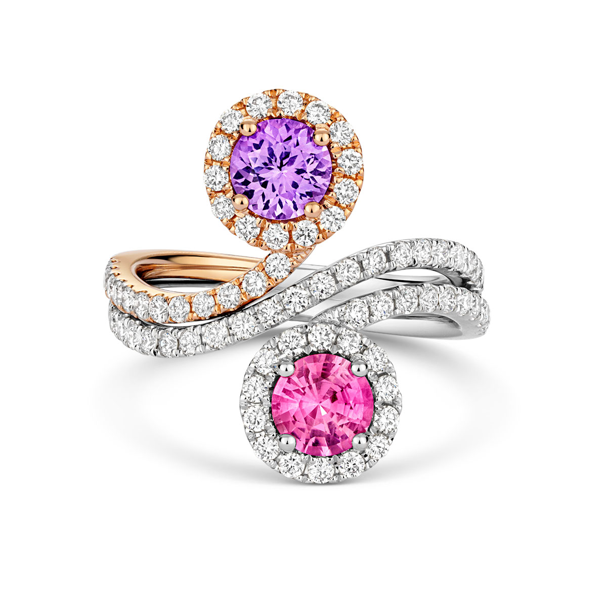 CANDY SWIRLS! This gorgeous pendant is set with glittering fine diamonds and two candy-coloured natural Madagascan weighing 1.68ct, round-cut Sapphires swirling in 18k Rose & White Gold.