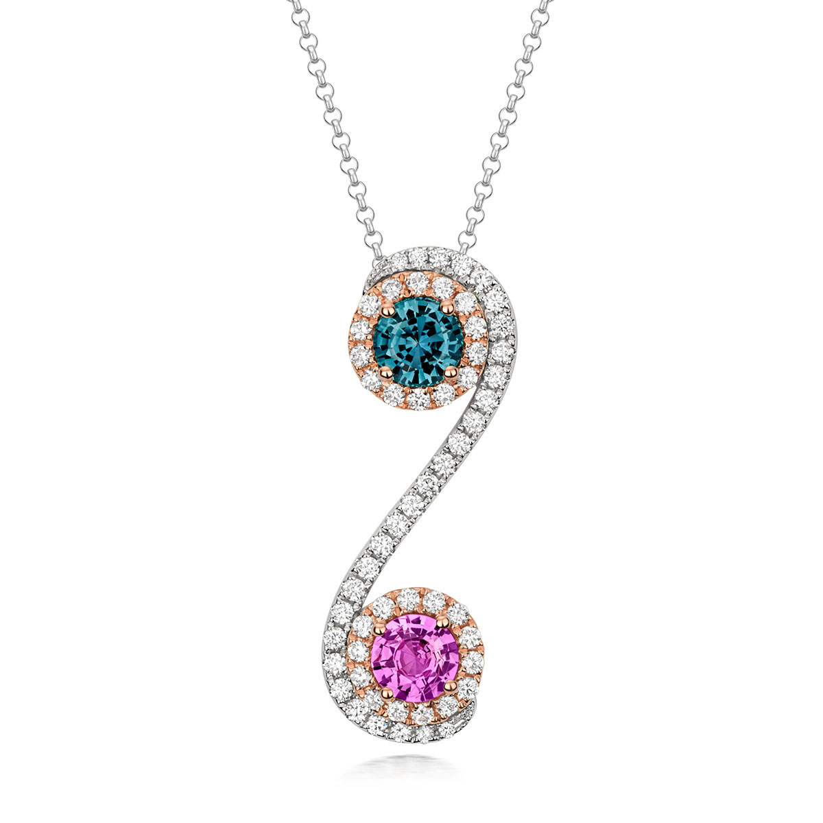 CANDY SWIRLS! This gorgeous dress ring is set with glittering fine diamonds and 1.74ct of candy-coloured natural Madagascan, round-cut Sapphires swirling in 18k Rose & White Gold.