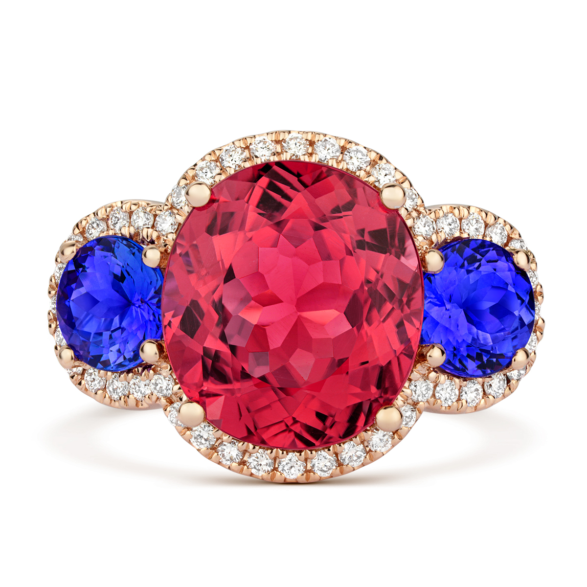 A bold cocktail ring suitable for that special soiree' set with glittering fine diamonds and a superb, 6.60ct cushion-cut Pink Tourmaline, all set in 18k Rose Gold.