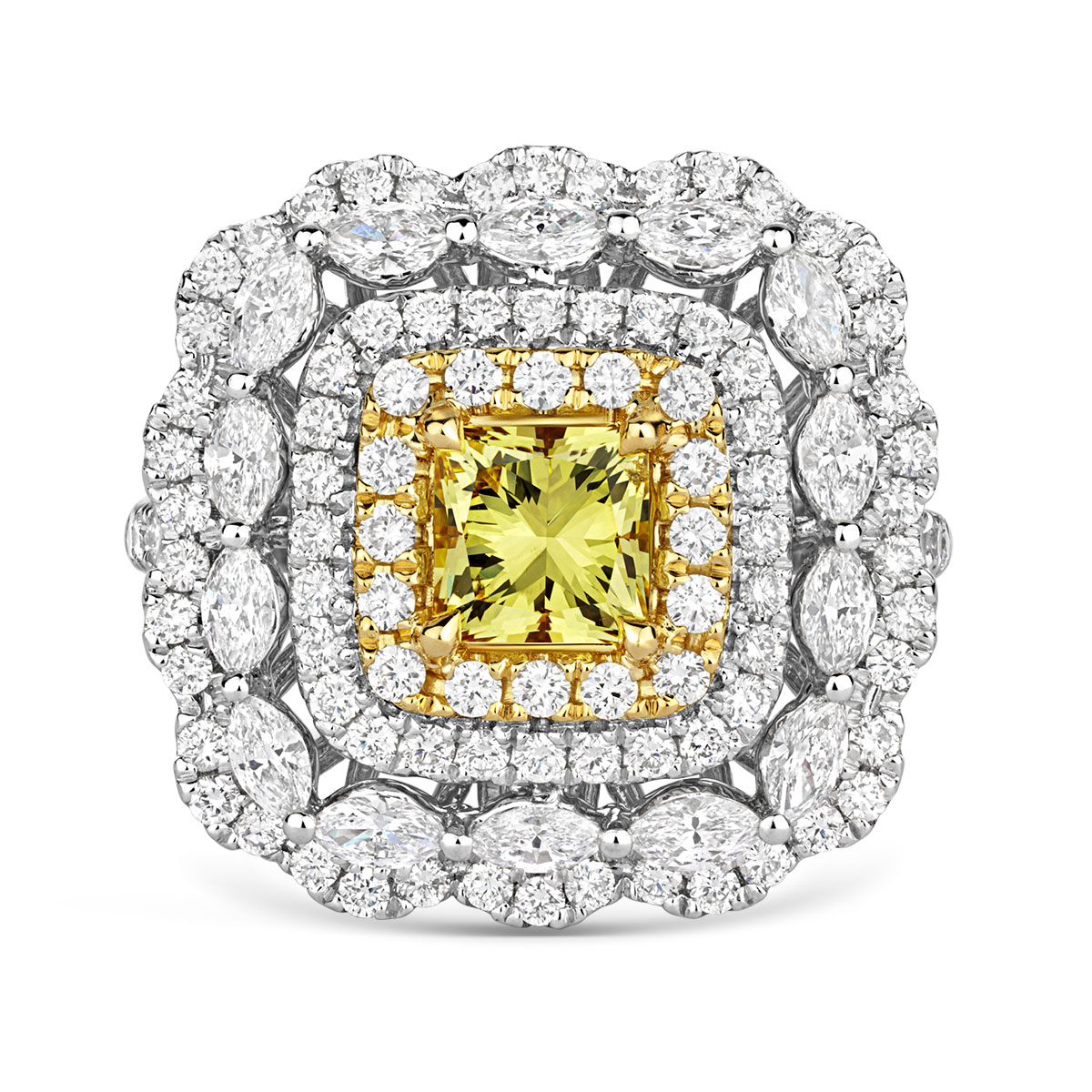 SUPER-FINE YELLOW! An gorgeous pendant crafted in 18k White & Yellow Gold and set with glittering fine white round & marquise-cut diamonds & an incredible 1.41ct cushion-cut (GIA-certified) Natural Fancy Yellow Diamond.