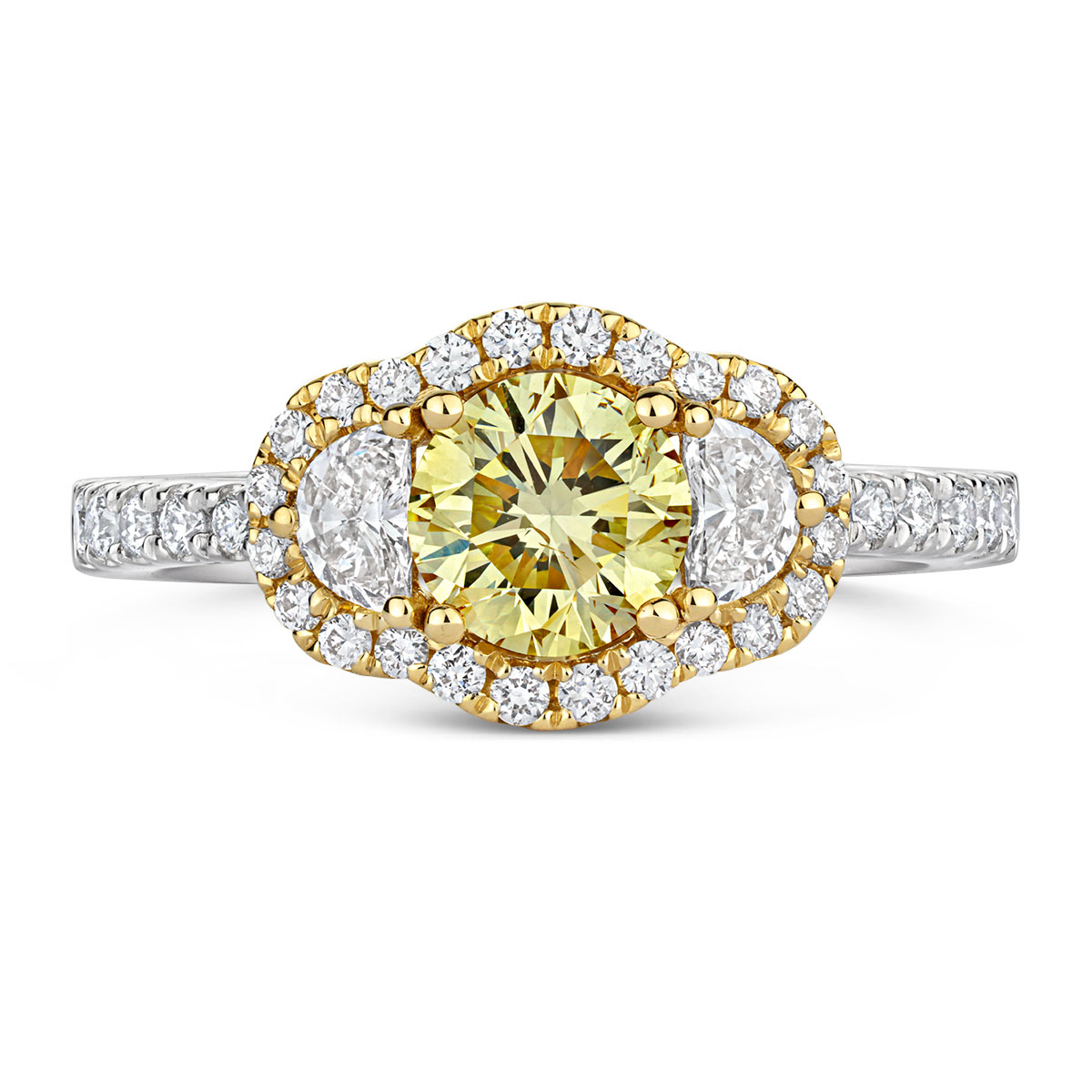 SHE SAID OH-YES! A timeless ring perfect for engagement or just for a special occasion. This ring has been created in Platinum & 18k Yellow gold and has been set with a combination of glittering fine white round-brilliant & trapezoid-cut diamonds as well as a mesmerising 1.57ct (GIA-certified) Cushion-cut, Natural Fancy Yellow Diamond.