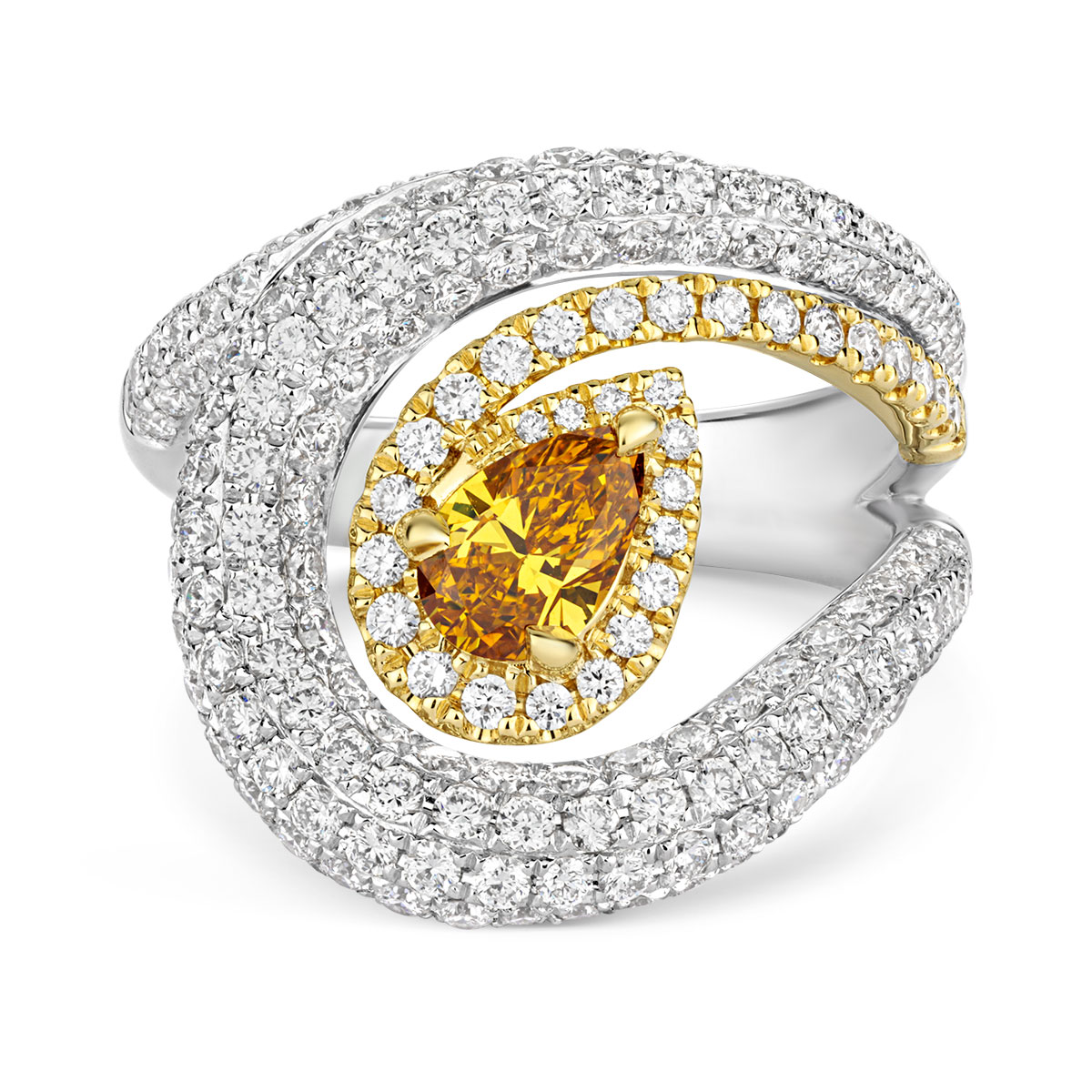 A momentous diamond ring crafted in 18k Yellow Gold and set with glittering fine white diamonds and an incredible, GIA-certified ultra-rare Natural Fancy Intense Yellow-Orange 1.94ct oval-cut Diamond.