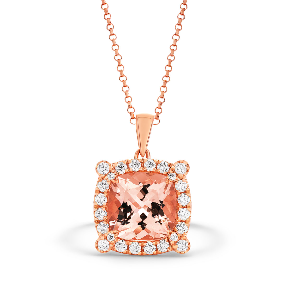 A simply stunning ring! Crafted in 18k Rose Gold and set with halo of glittering fine diamonds & a gorgeous peach-pink, 2.20ct cushion-cut Morganite gemstone, this gorgeous dress ring simply ticks all the boxes.