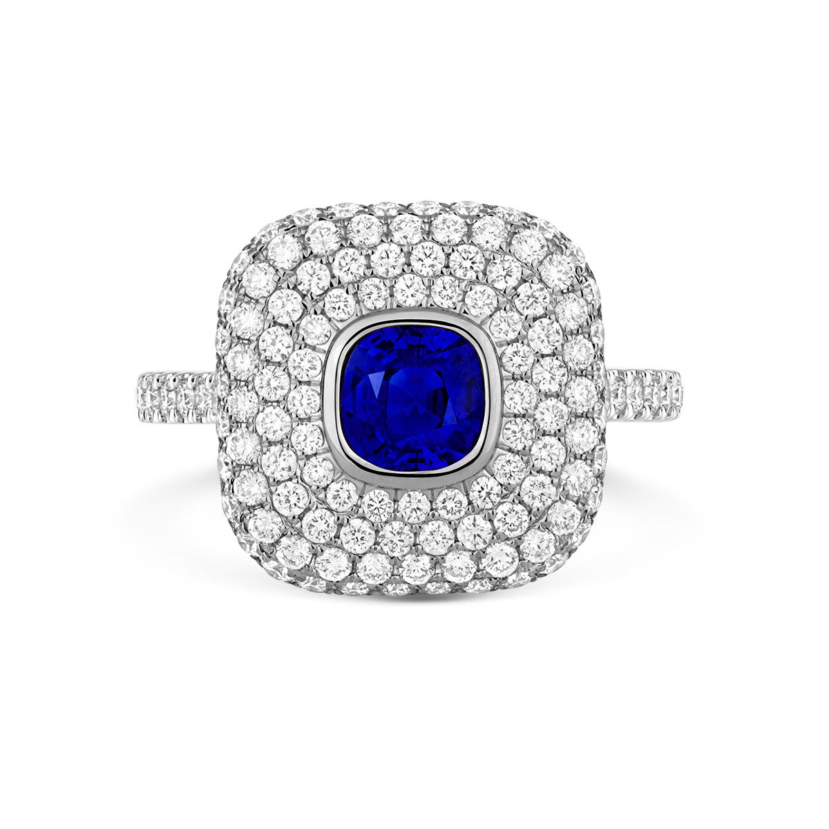 ROYAL BLUE! This gorgeous dress ring has been crafted in 18k White Gold and set with glittering fine diamonds & an exquisite 2.35ct Royal Blue cushion-cut Ceylon Sapphire.