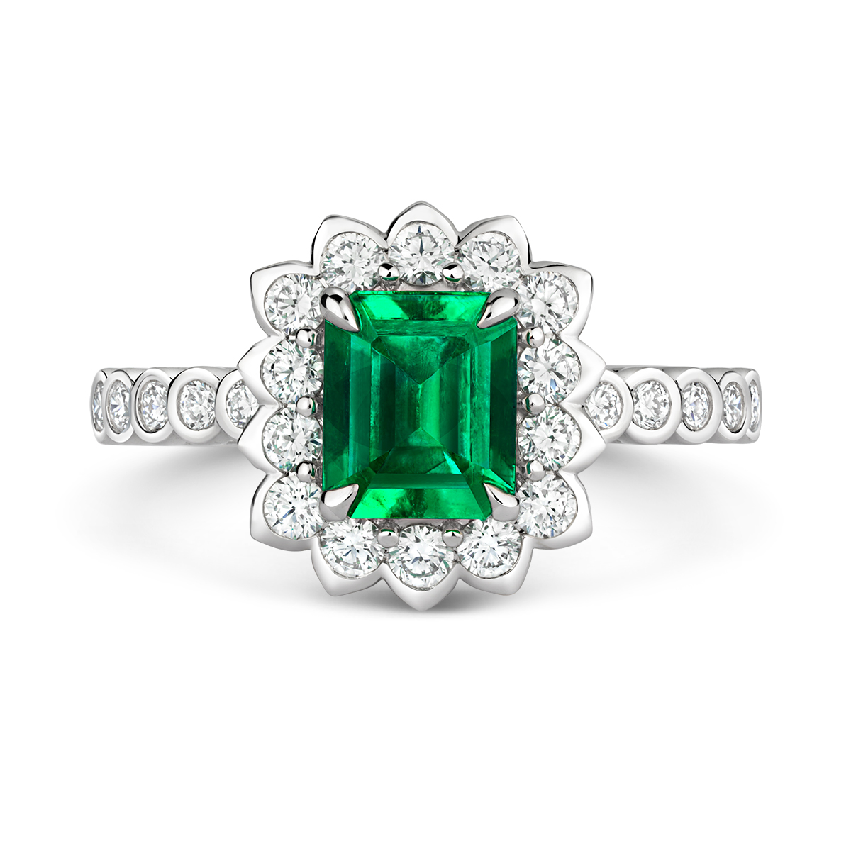 Crafted in Platinum and set with a combination of glittering round brilliant-cut & emerald-cut diamonds and a very lush 1.05ct emerald-cut Zambian Emerald, this ring is simply a stunner.