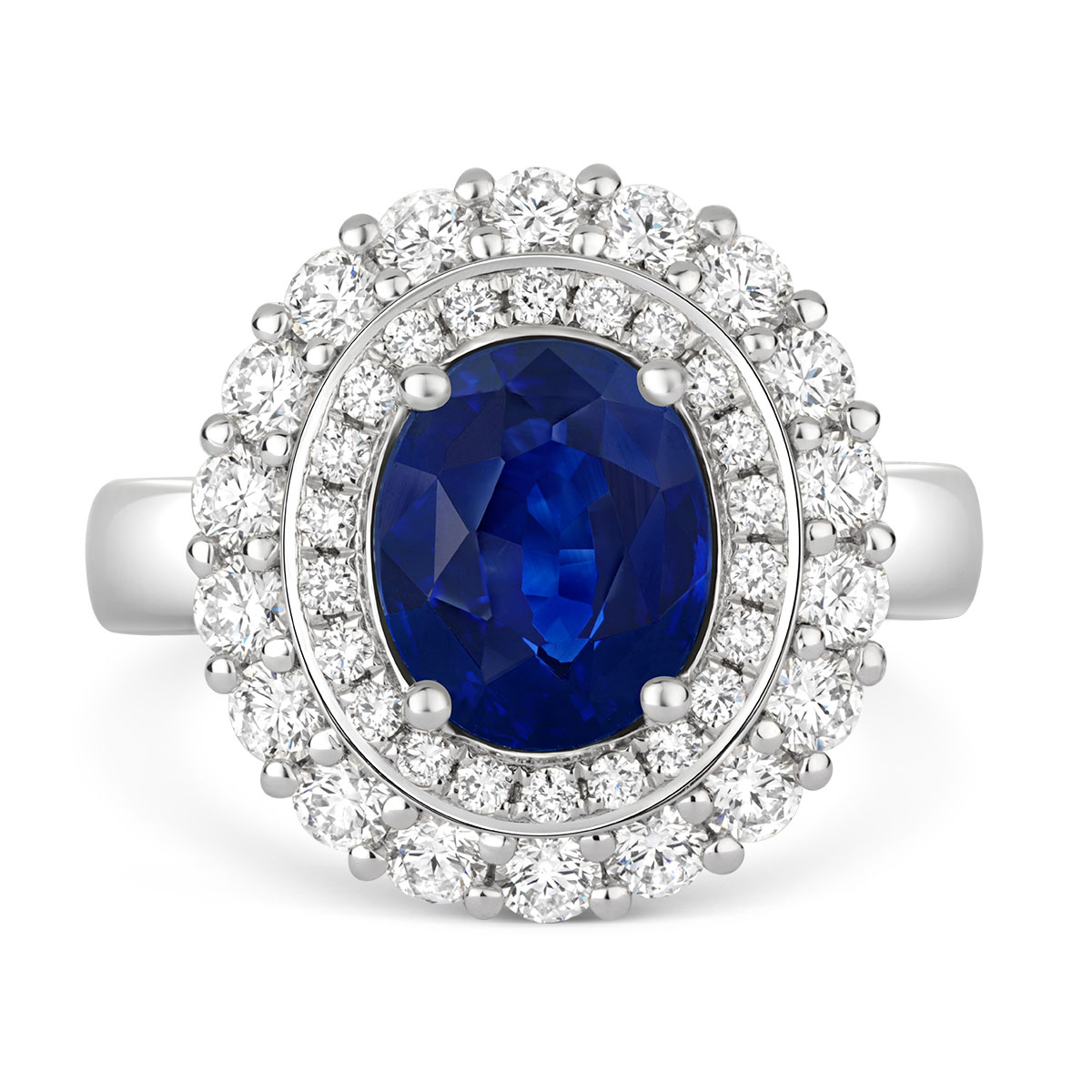 A stunning legacy ring crafted in Platinum and set with glittering fine diamonds and a rich royal blue, 2.31ct oval-cut Ceylon Blue Sapphire.