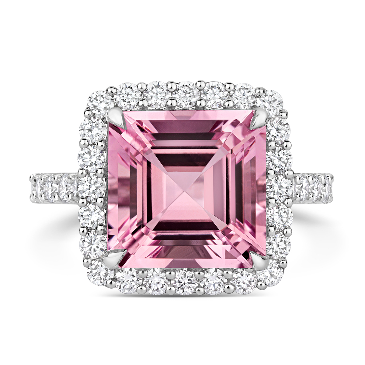 Rose Pink - A timeless design set in 18k White Gold ring and set with a double halo of glittering fine white diamonds and a vivid, 1.86ct rose-pink natural unheated Madagascan Morganite gem.