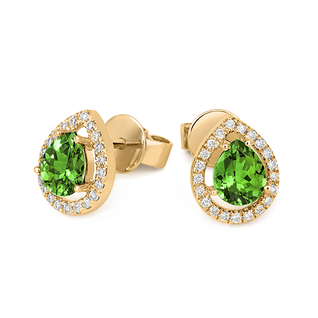 A classic & contemporary pendant set with fine diamonds & a pear-cut Peridot gemstone in 18k Yellow Gold.