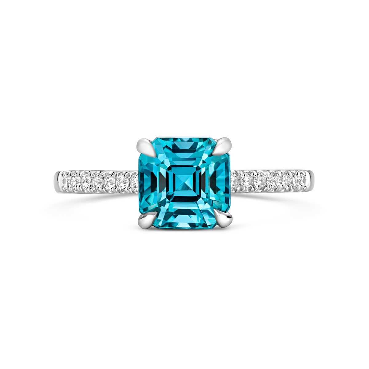 A gorgeous classic 3-stone dress ring has been crafted in 18k White Gold and set with fine diamonds & a 3.20ct oval-cut vivid Blue Zircon gemstone.