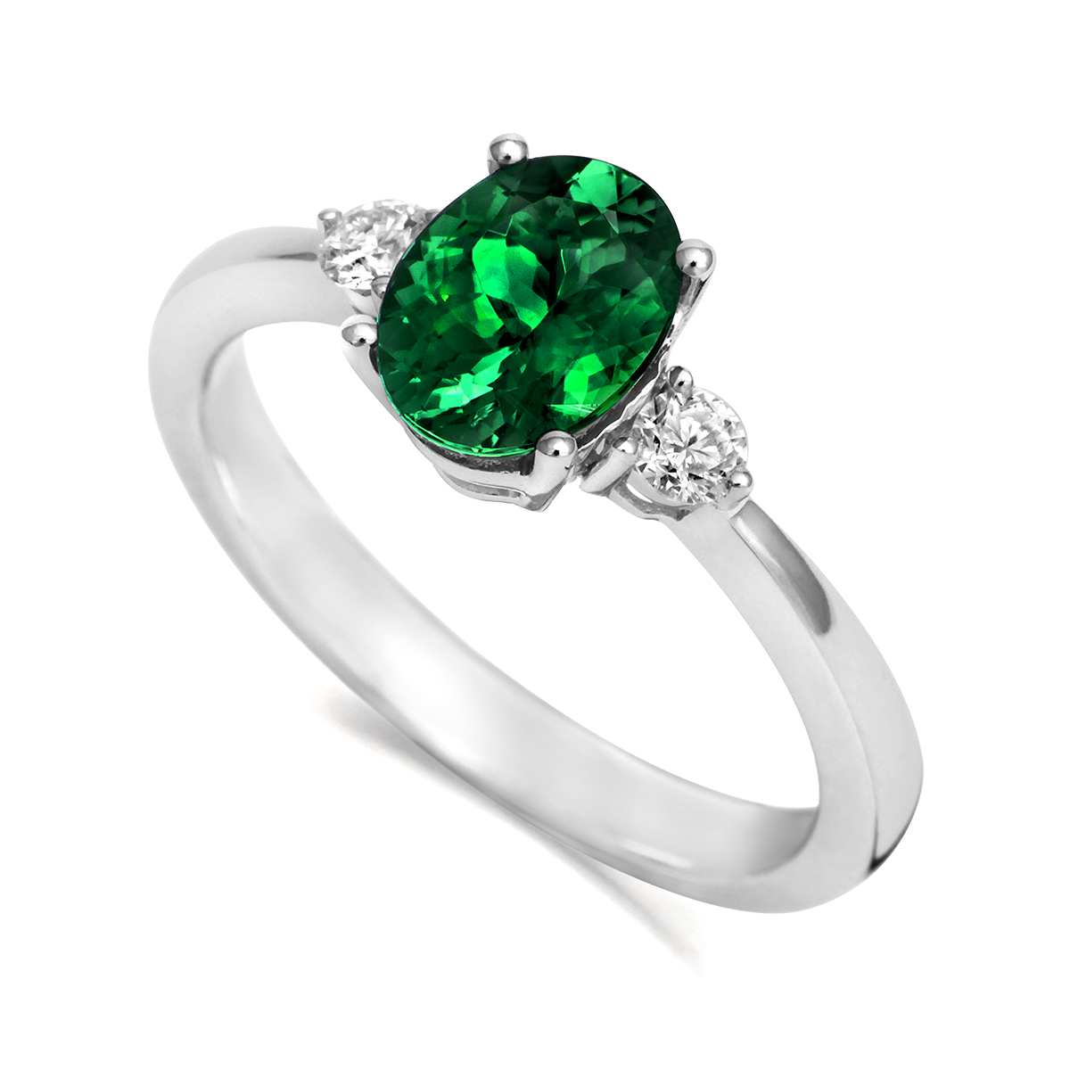 A gorgeous classic 3-stone dress ring crafted in 18k White Gold and set with fine diamonds & a fancy-cut bottle-green Tourmaline.