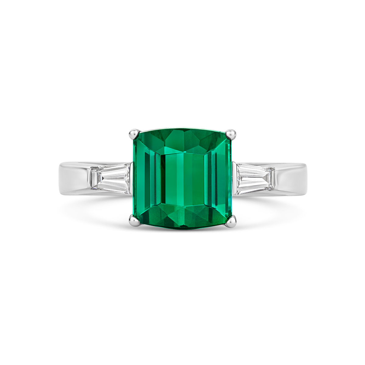 LUSH GREEN! This gorgeous, classic 3-stone ring has been crafted in 18k White Gold and set with glittering fine diamonds & a 1.88ct oval-cut lush Green Tourmaline.