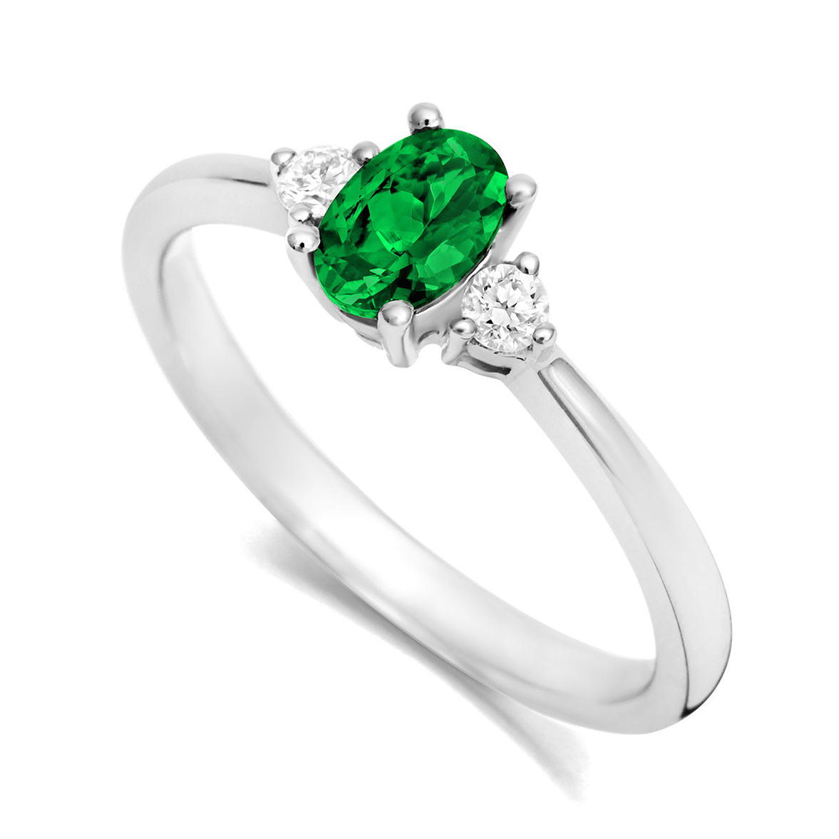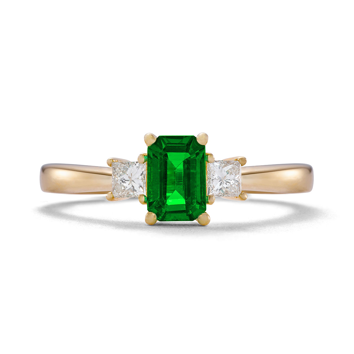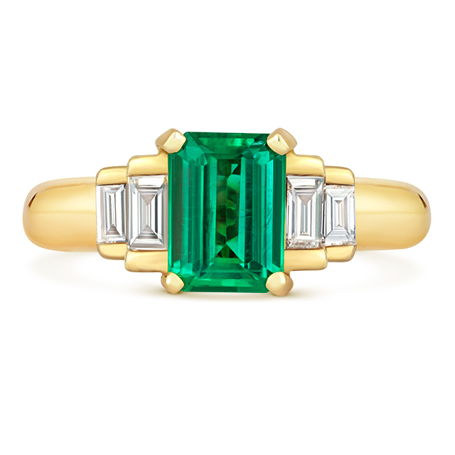 This gorgeous classic dress ring has been crafted in Platinum and set with glittering fine trapezoid-cut diamonds & a luscious 1.87ct emerald-cut Emerald.